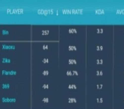 LPL榜首赛段常规赛登峰组上单数据:前15经济差Bin榜首257